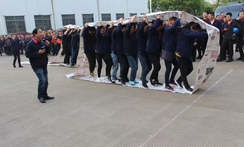 首先是卷报纸比赛,各部门参赛选手像搭火车一样排成一排,头上顶着报纸。